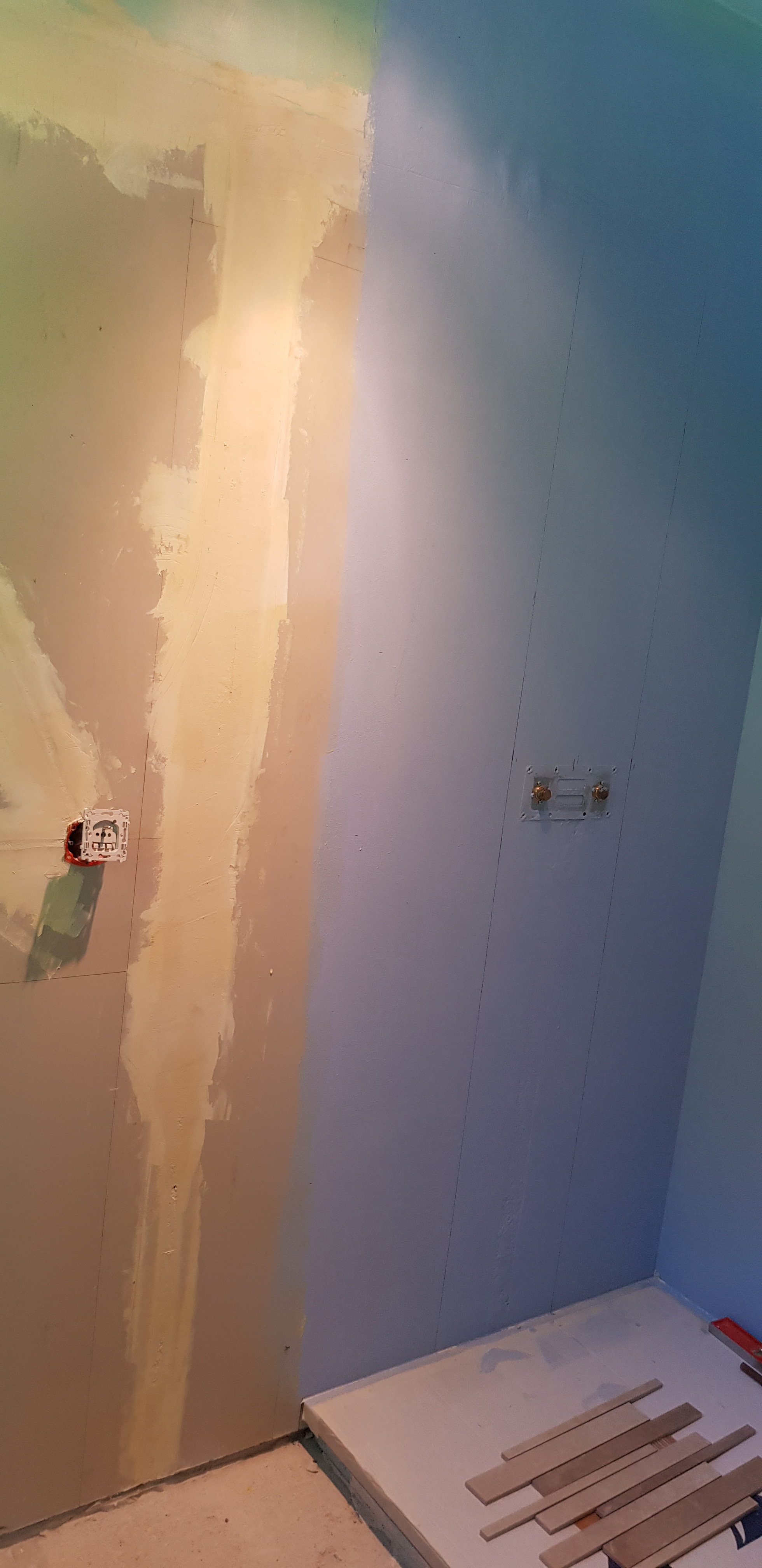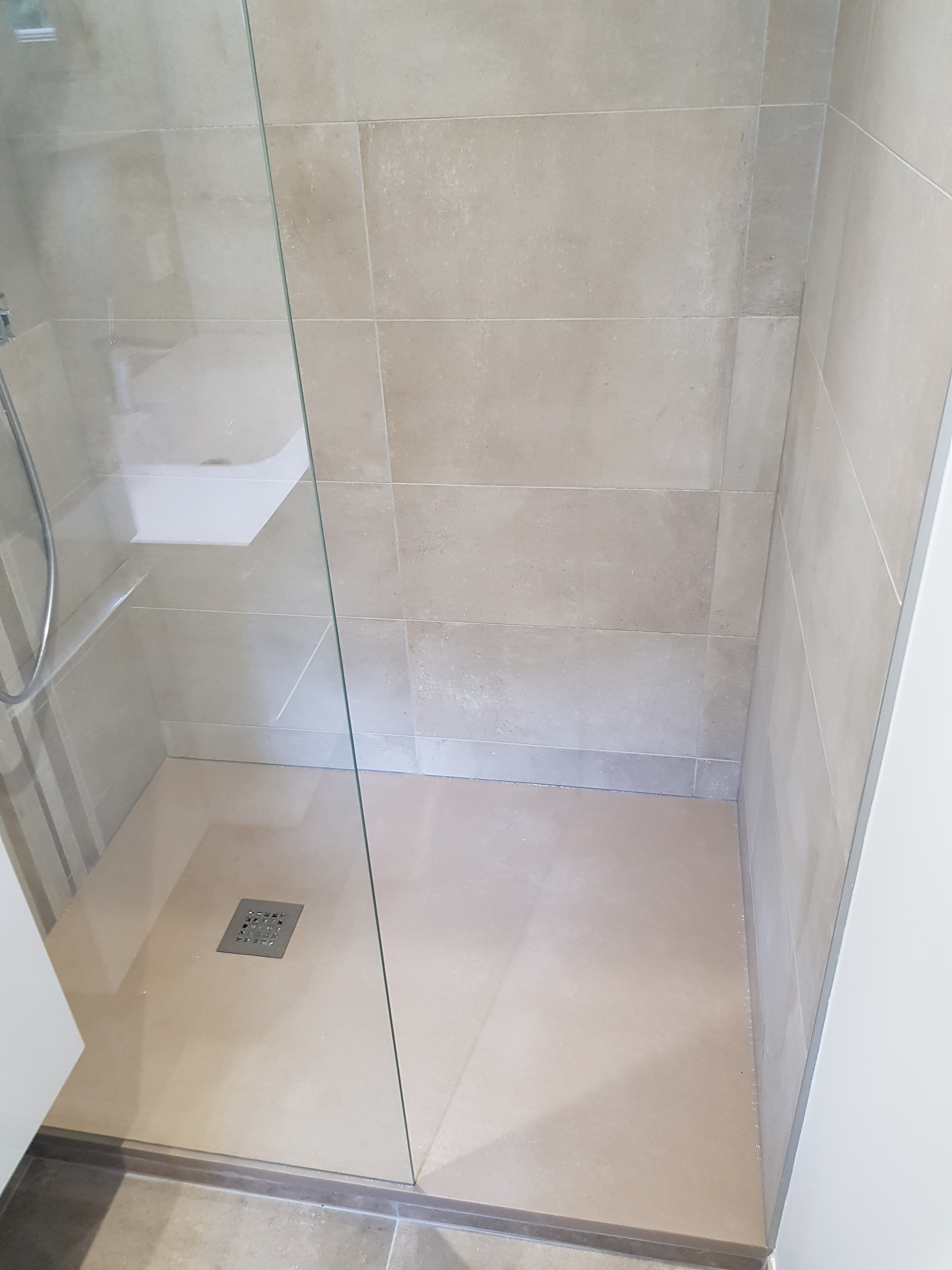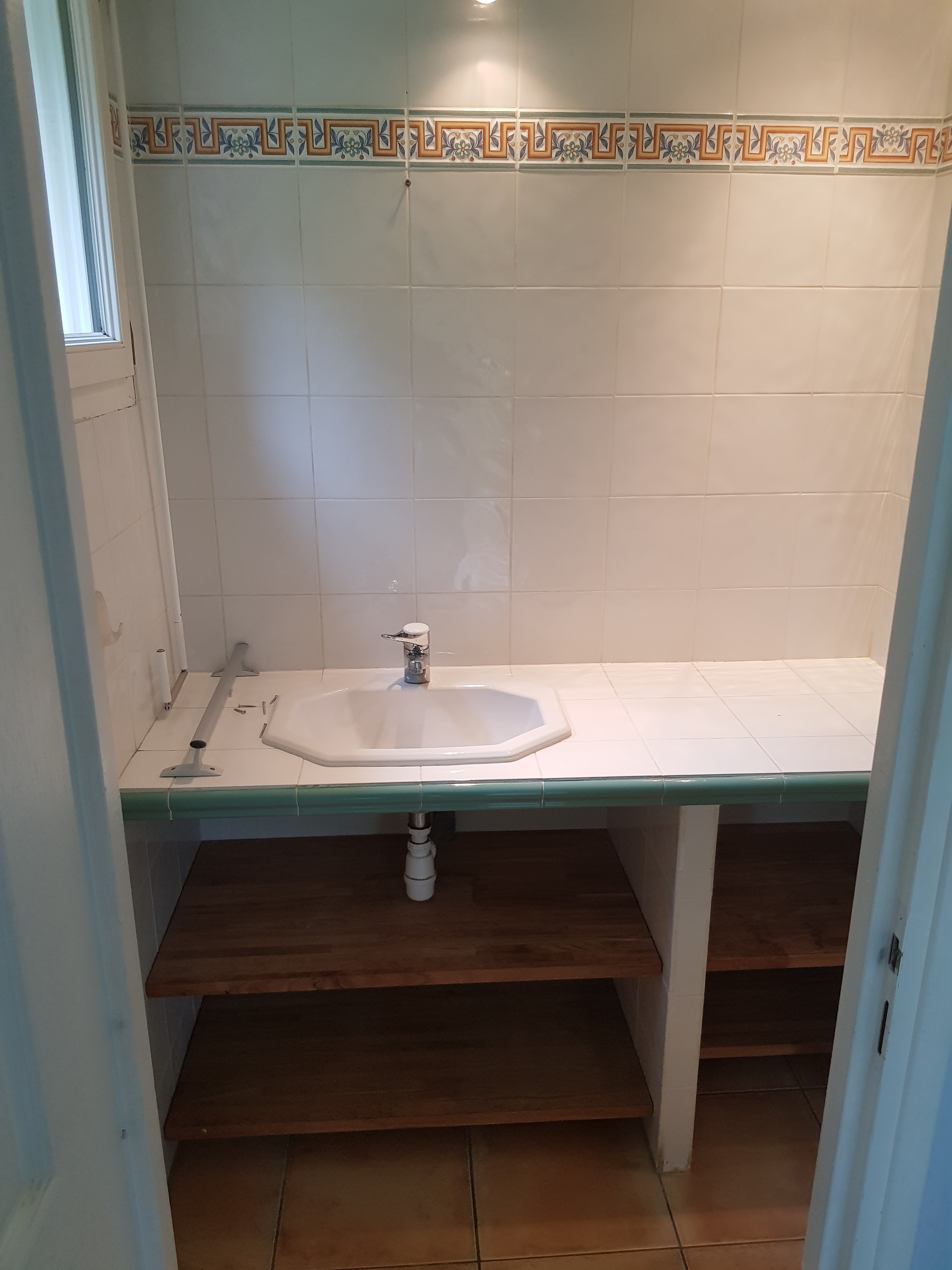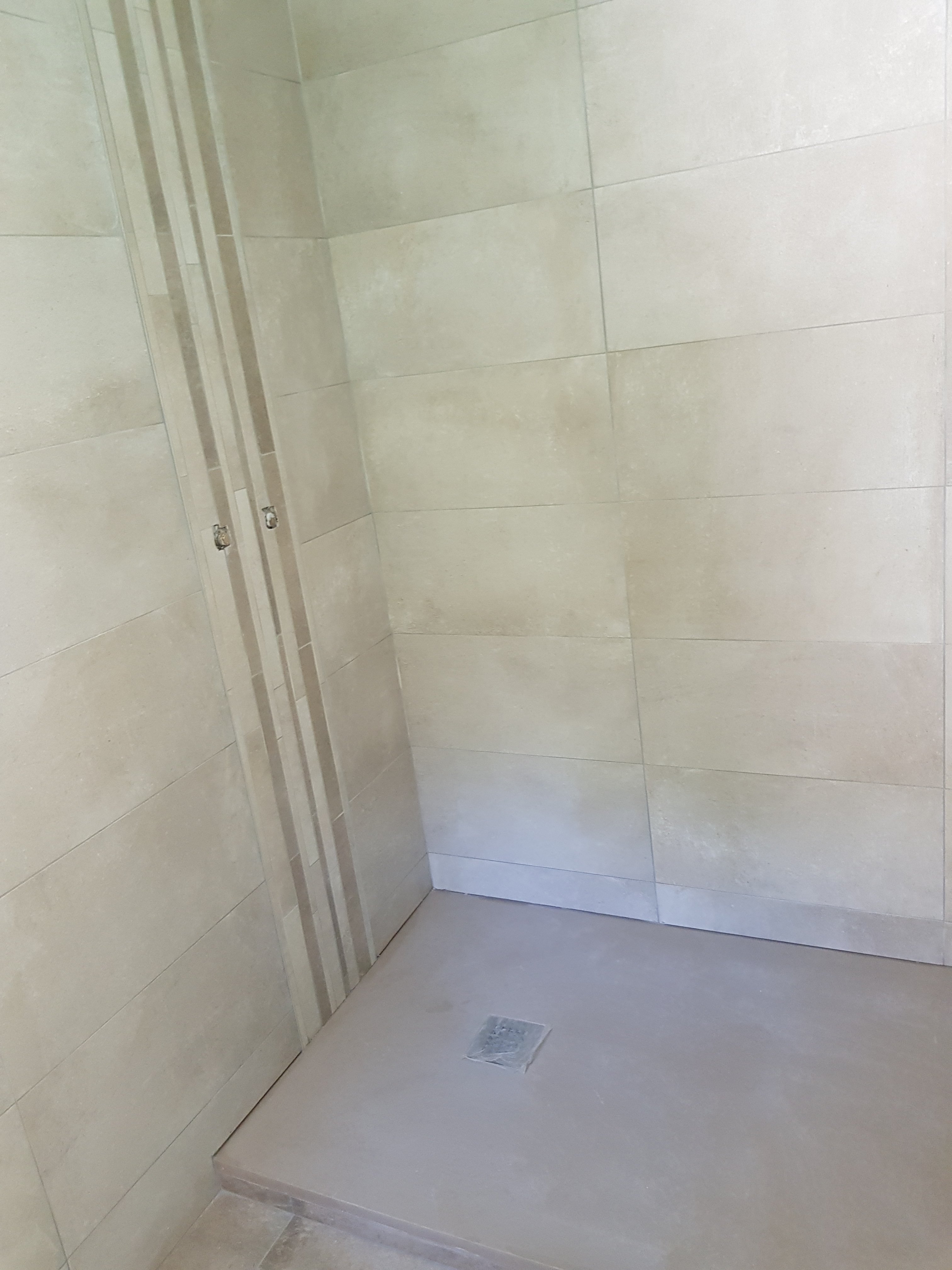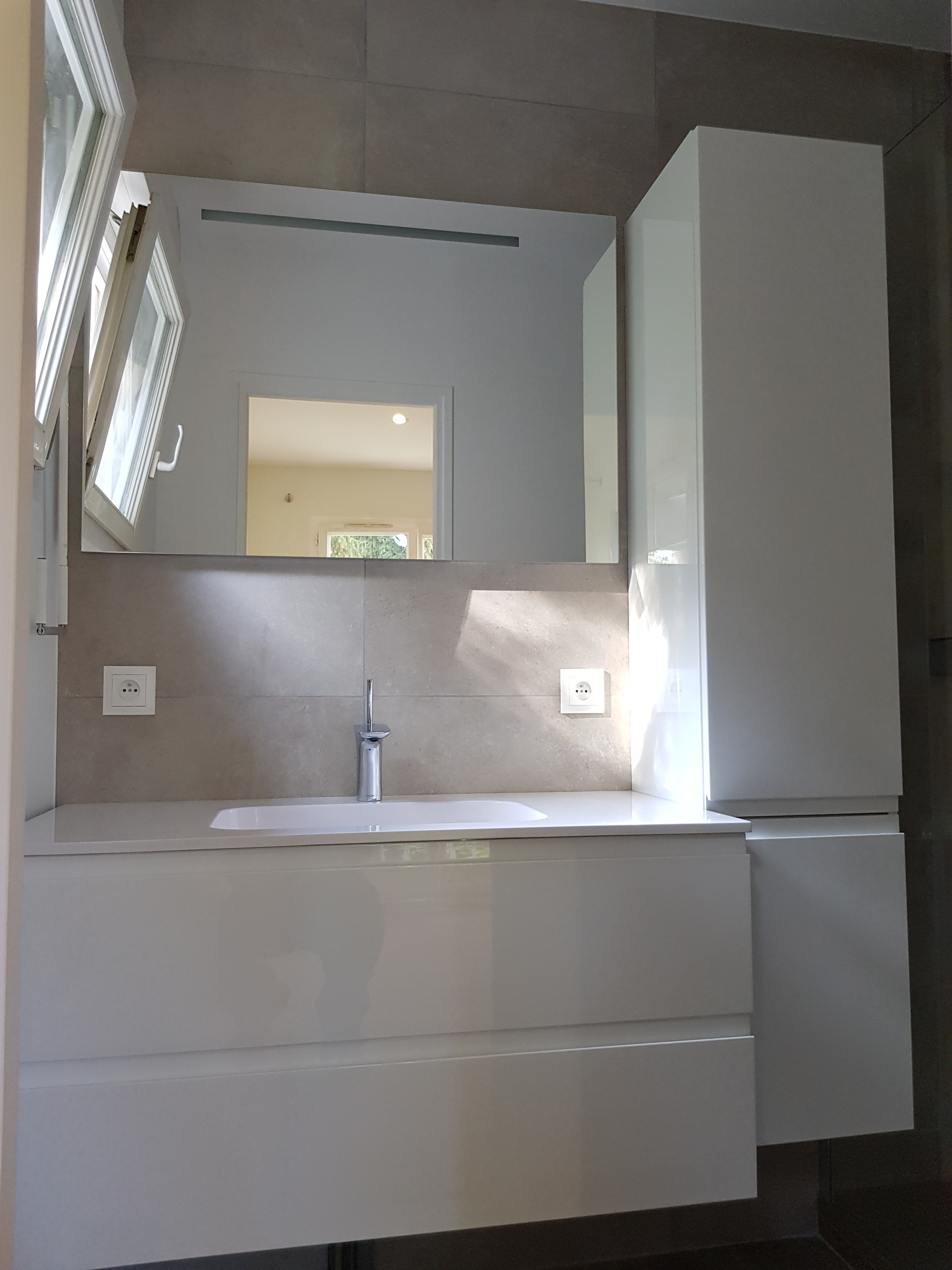 Sur cette prestation le client voulait réaménager son espace douche mais voulais aussi un meuble de salle de bain confortable. Nous avons donc tous déposé, les sanitaire les carrelages sol et murs. nous avons aussi remplacer les doublages des murs abimés par la dépose de la faïence. On a crée un faux plafond et intégré des spots. L’électricité et la plomberie ont elle été refaite à neuve pour réalimenter les nouveaux appareils sanitaires. Ensuite nous avons posé les sanitaires, sur ce chantier nous avons donc un receveur de douche Syan couleur beige, une paroi de douche Rothalux Atéa, un meuble de salle de bain en 90 de marque Gb Group type Unic vasque centré. Un mitigeur de lavabo Hanshgohé Puravida. la douche reçois un Showerpipe tablette avec douche de tête. L’ensemble du carrelage de la salle de douche à été refait ainsi que la peinture.